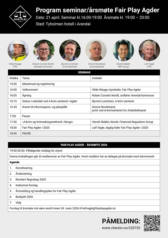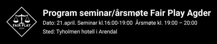 Fair Play Agder har gleden av å invitere til årsmøte og seminar i Arendal: